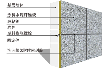 以涂料饰面的纤维水泥压力板为饰面层,涂料可做质感涂料、真石漆、水包水等效果,可满足不同的装饰需求。