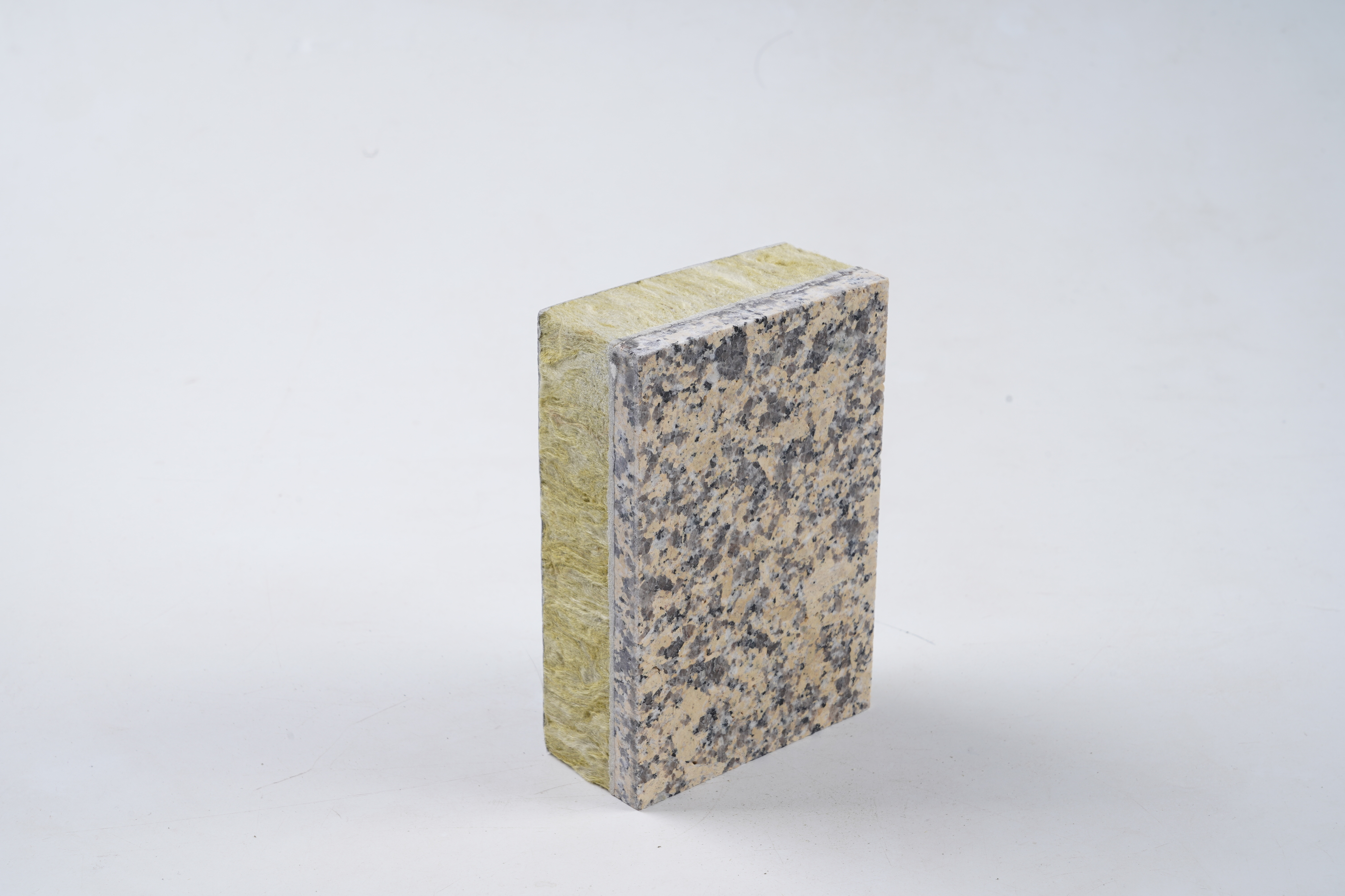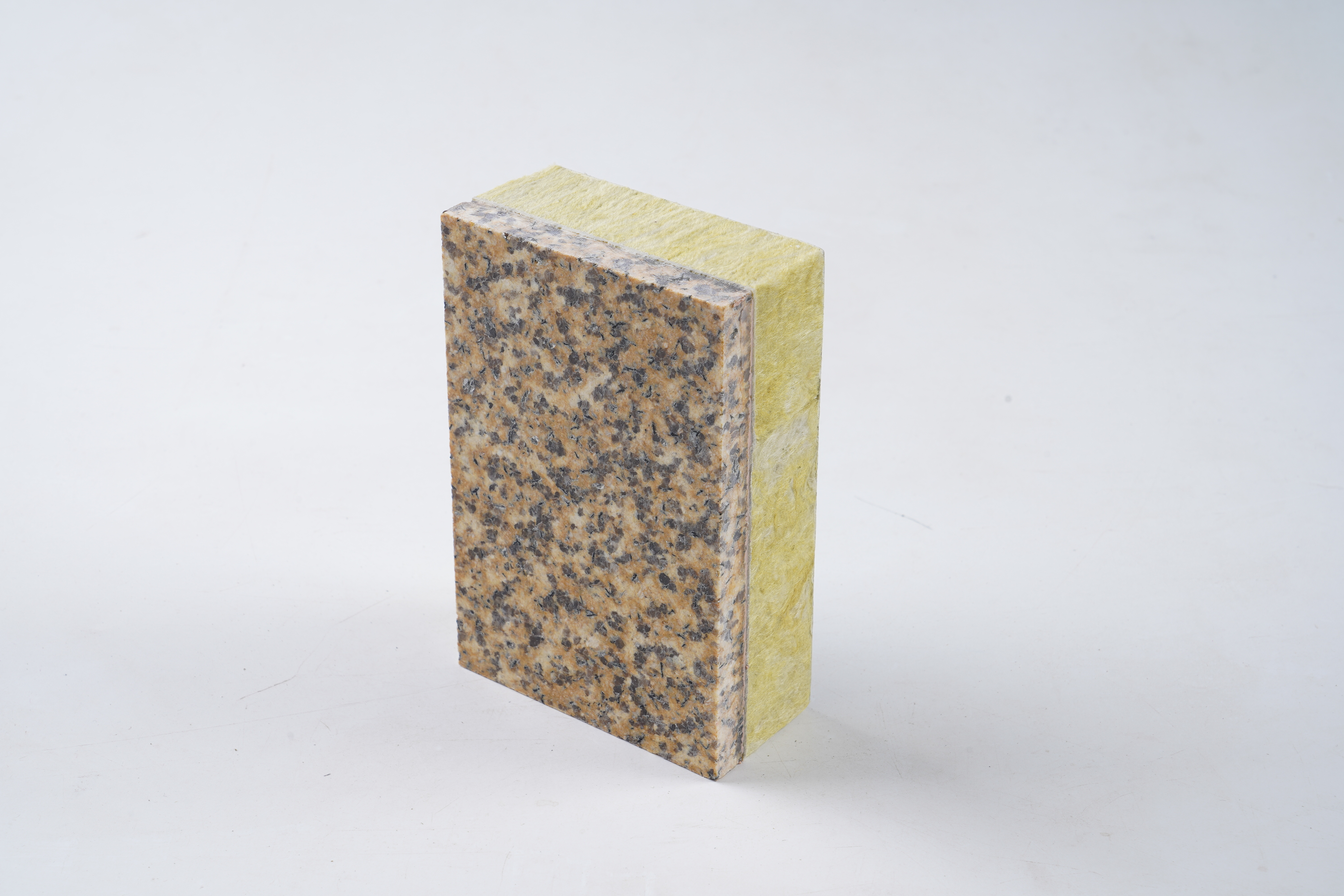 石材装饰节能复合板,是以10-12mm厚天然石材板为外层面板,以岩棉为芯材,以0.5mm玻纤增强水泥基卷材为底衬,经自动化生产流水线连续发泡一次性热压复合成型,无需二次粘接,实现在线连续生产,加工工艺属业内首创。
