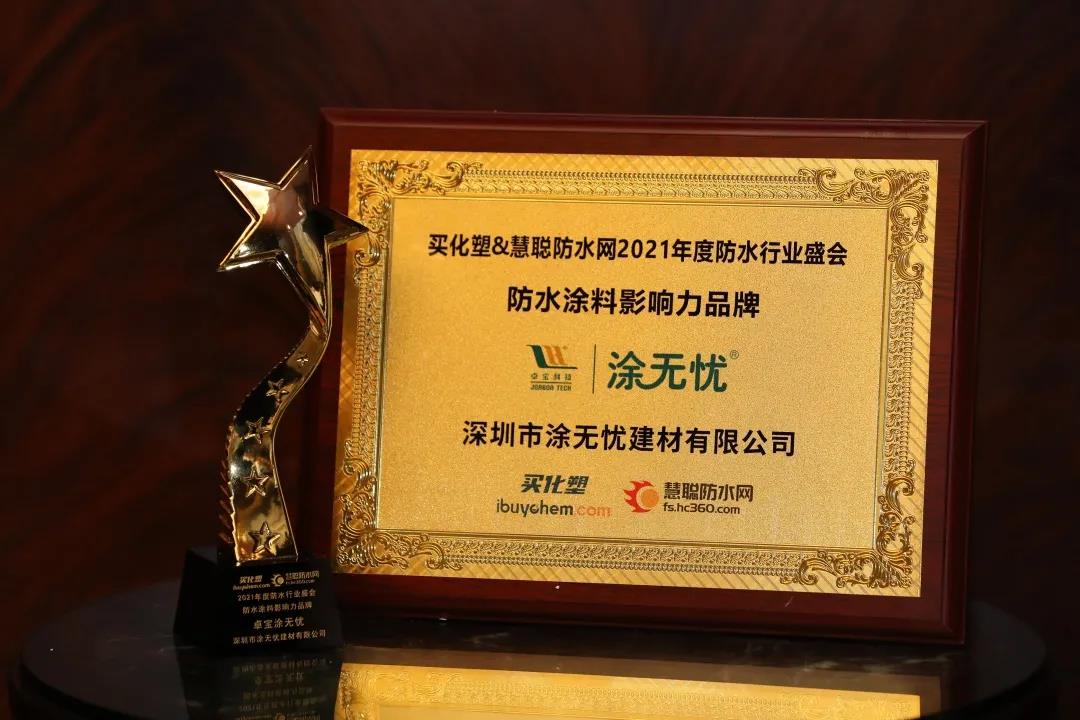 2021年6月25-26日,以“聚力融创新格局”为主题的买化塑涂料行业盛会&防水行业盛会——2021涂料高峰论坛暨防水行业高峰论坛在北京国贸大酒店召开。活动举行了规模盛大的影响力品牌颁奖活动,对过往一年中具有突出表现的优秀企业进行表彰,卓宝一举斩获了4项大奖:“工程防水影响力品牌”、“防水卷材影响力品牌”、“高分子防水卷材影响力品牌”,旗下品牌涂无忧荣获“防水涂料影响力品牌”。