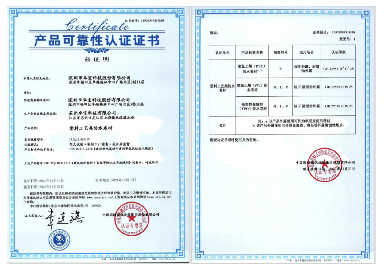 近日,卓宝热塑性聚烯烃(TPO P 1.5mm)防水卷材取得最新型式检验报告,其中低温弯折性达到-50℃,人工气候加速老化为8000小时! 该检验结果远高于国标的要求,是行业内为数不多的能够在上述指标远超国标要求的企业之一。(注:国标要求TPO防水卷材在暴露屋面使用需达到人工气候加速老化时间为2500小时。)