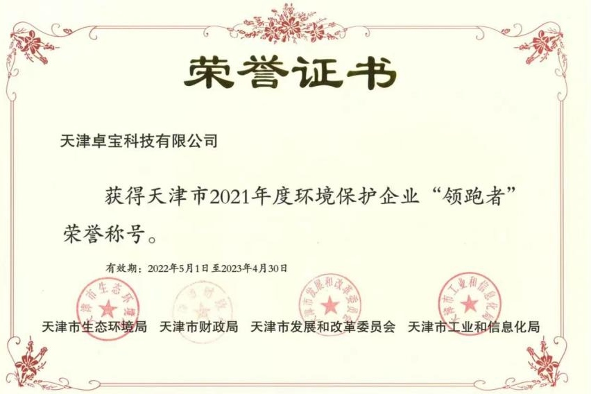 日前,天津市生态环境局公布了“2020年度天津市环境保护企业‘领跑者’”名单,共有17家知名企业上榜,卓宝科技天津生产基地光荣入选,位列其一。