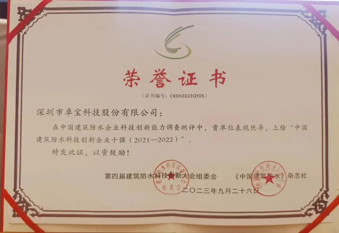 12月26日,全联房地产商会、链筑两会隆重召开“聚焦内循环·提升内生力”2020中国房地产产业链战略创新峰会暨年度盛典,会上正式发布《2020年度中国房地产产业链战略诚信供应商研究报告》。卓宝科技入选建筑防水材料类品牌合作首选率TOP10榜单,这已是卓宝连续四年获此荣誉。