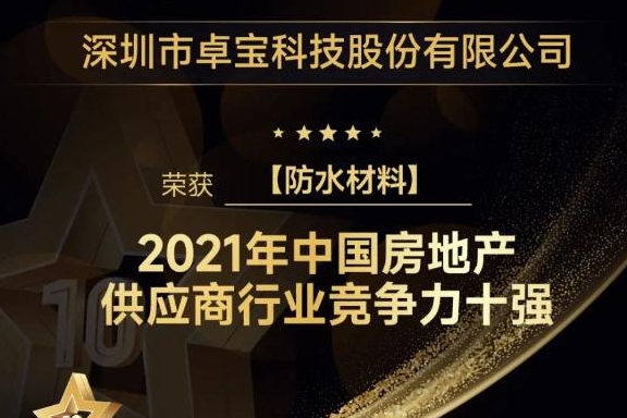 12月11日,2020中国房地产供应商行业年度榜单发布,卓宝科技获评“2020中国房地产供应商竞争力十强(防水材料)”,并以73.1%的开发商推荐率位列榜单第二位。