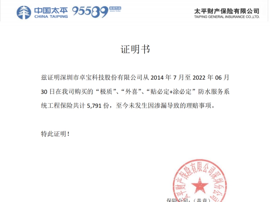 防水工程质量保险今日再添新成员!2021年3月15日上午,卓宝科技与太平财险在卓宝科技深圳总部举行了“卓宝科技核心系统保险签约仪式”, 除“贴必定+涂必定”防水服务系统外,卓宝科技旗下外喜防水保温一体化系统等几大核心系统也正式引入保险保障服务。